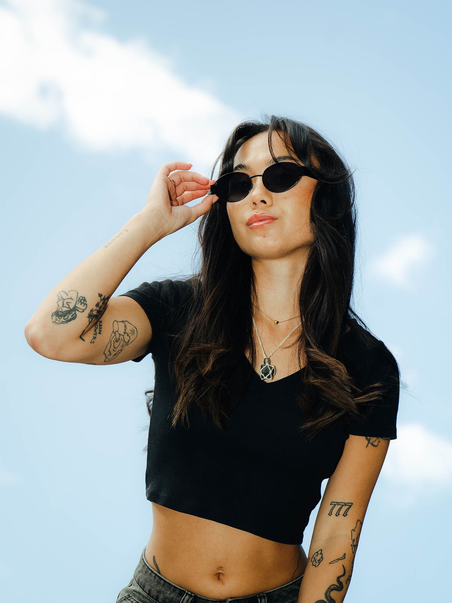 Stilig og smal solbrille fra DRØM med et fresht, urbant uttrykk. "Aleah" har klassiske, mørke polykarbonatlinser med 100 % UV400-beskyttelse – perfekt for solfylte dager.